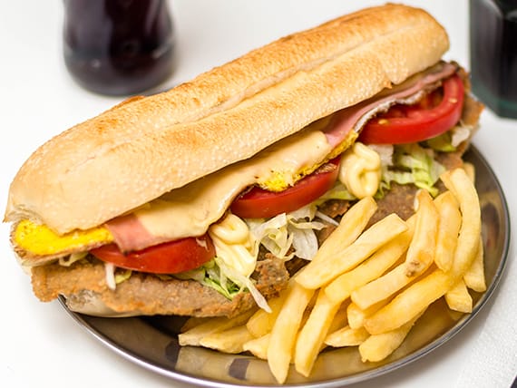 Sandwich de milanesa de pollo XL completo con papas fritas